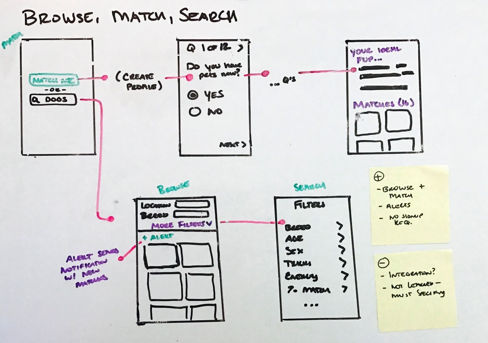 I had the opportunity to share my ideas with a recent pet adopter for feedback. Based on their input and a review of my research, I decided to move forward with the Browse, Match or Search concept.