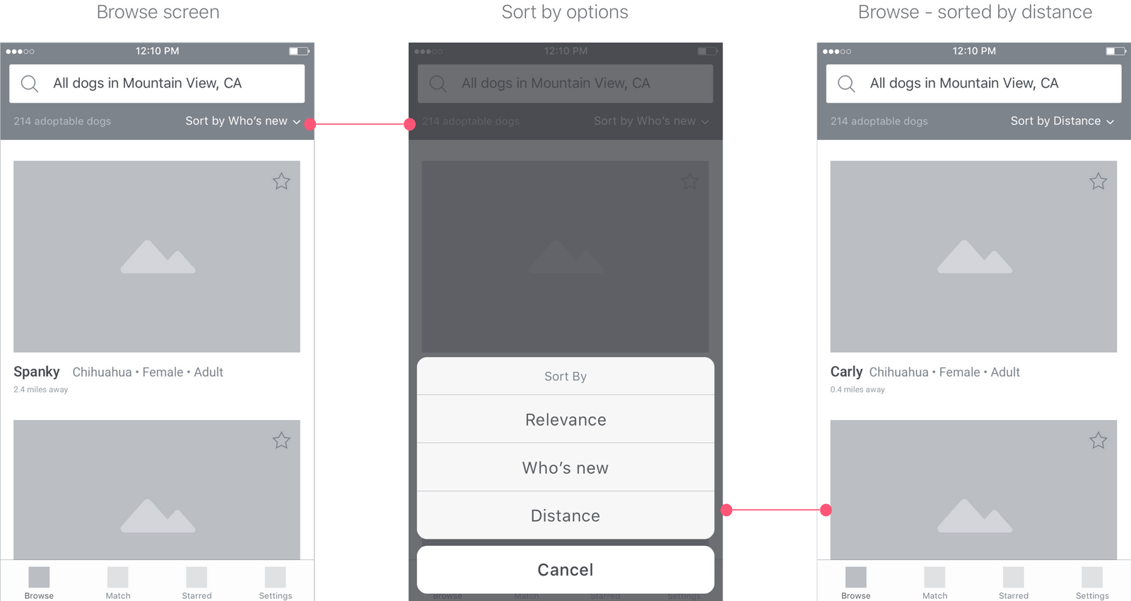 Users can sort by newly added pets, distance and relevance. Relevance is based on a user's survey results and/or breeds and other traits of pets they've recently visited.