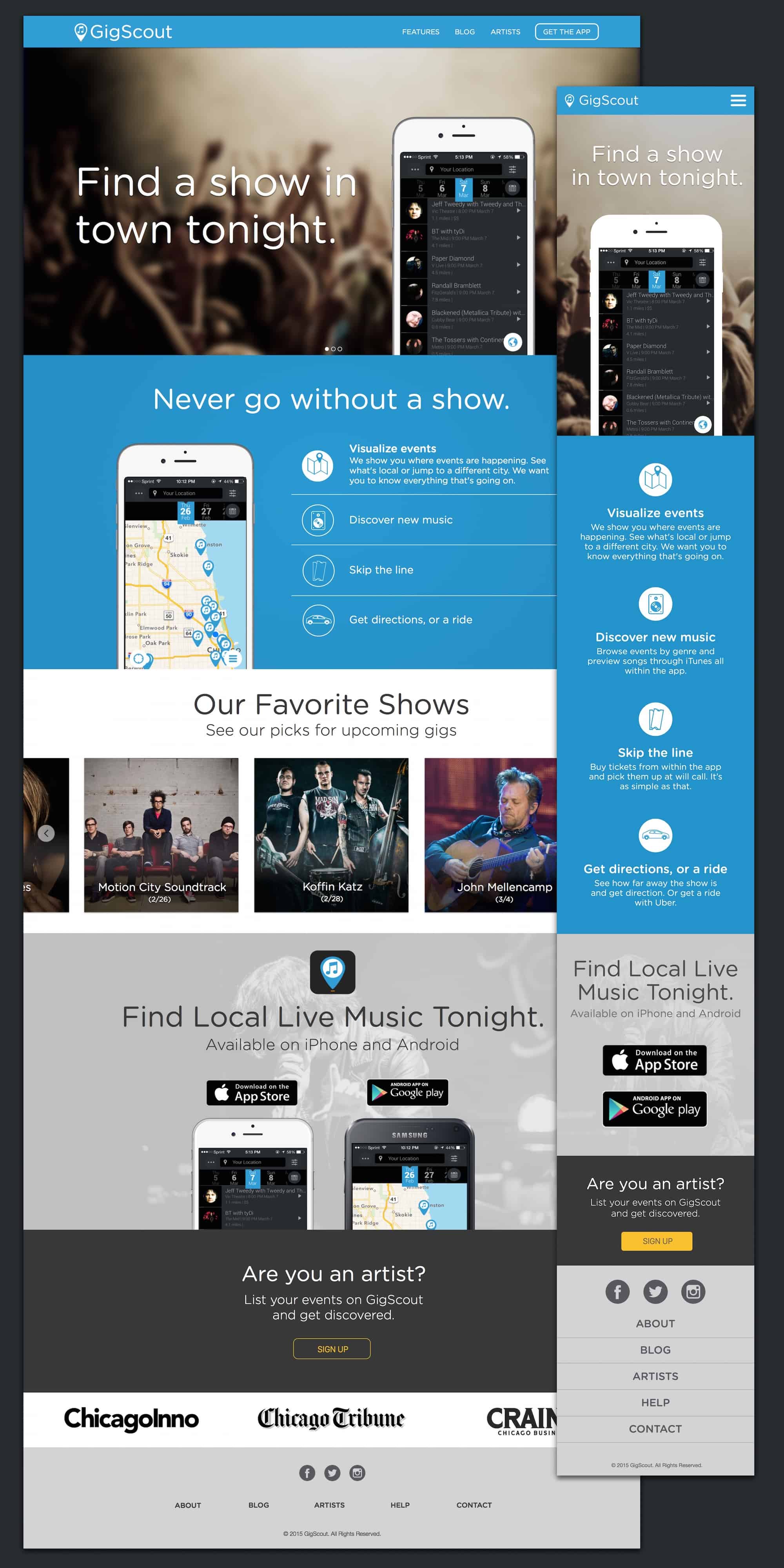 Before starting work on the marketing site, I spent some time understanding where GigScout fits in the live music industry. I conducted a competitive audit and did some usability testing to determine what features should be highlighted on the site. I then worked with the client to define a clear visual brand identity and started working on content and responsive wireframes.
